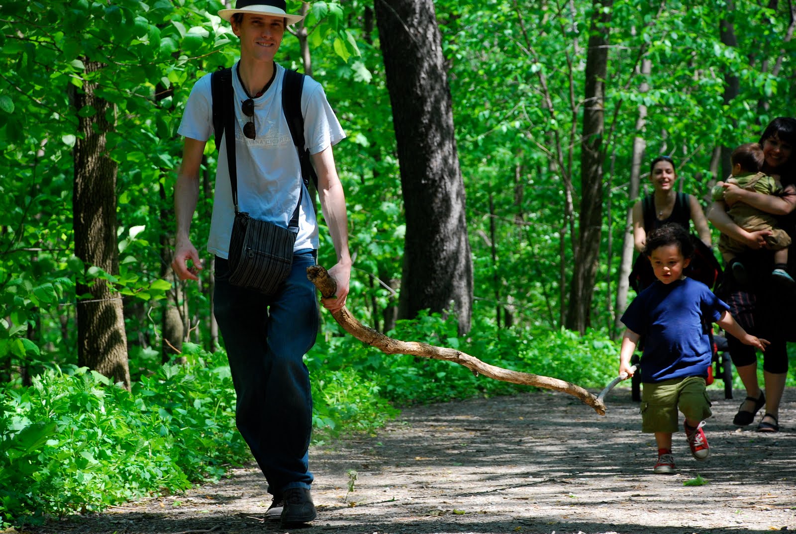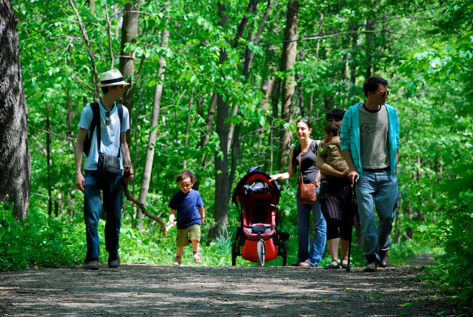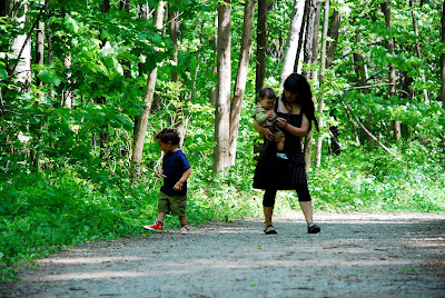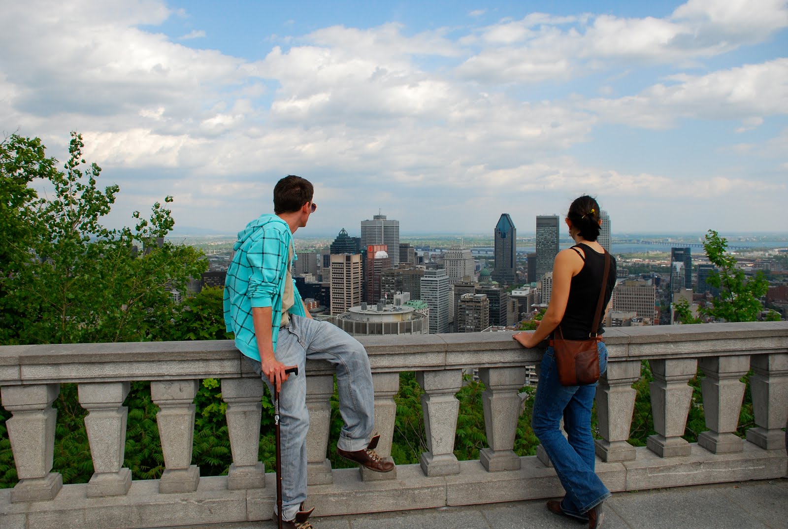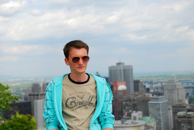 Après moultes péripéties et stratèges pour faire aller Matis dans la bonne direction, celle du sommet, et pas les dizaines de petits chemins annexes, nous somment arrivés en haut. Pas en haut, mais en Haut. Vu d'en bas, le Mont-Royal, ça paye pas de mine, mais une fois au sommet, on se rend compte de l'étendue de Montreal, de son découpage particulier causé par le fleuve et les parcs, et on comprend vraiment que l'on se trouve face (ou plutôt en plein) dans une ville de type "américaine": quadrillage des routes et avenues, buildings du centre ville, et malgré cette urbanisation, un nombre relativement élevé de verdure.